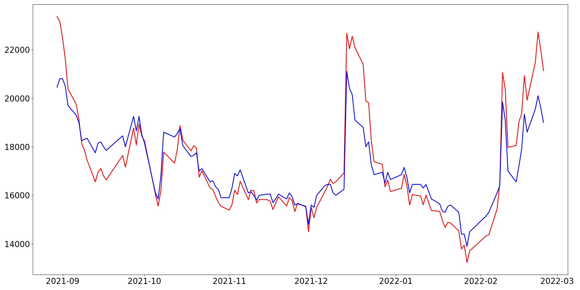 [ - : 실제값(종가) / - : 예측값(종가) ]