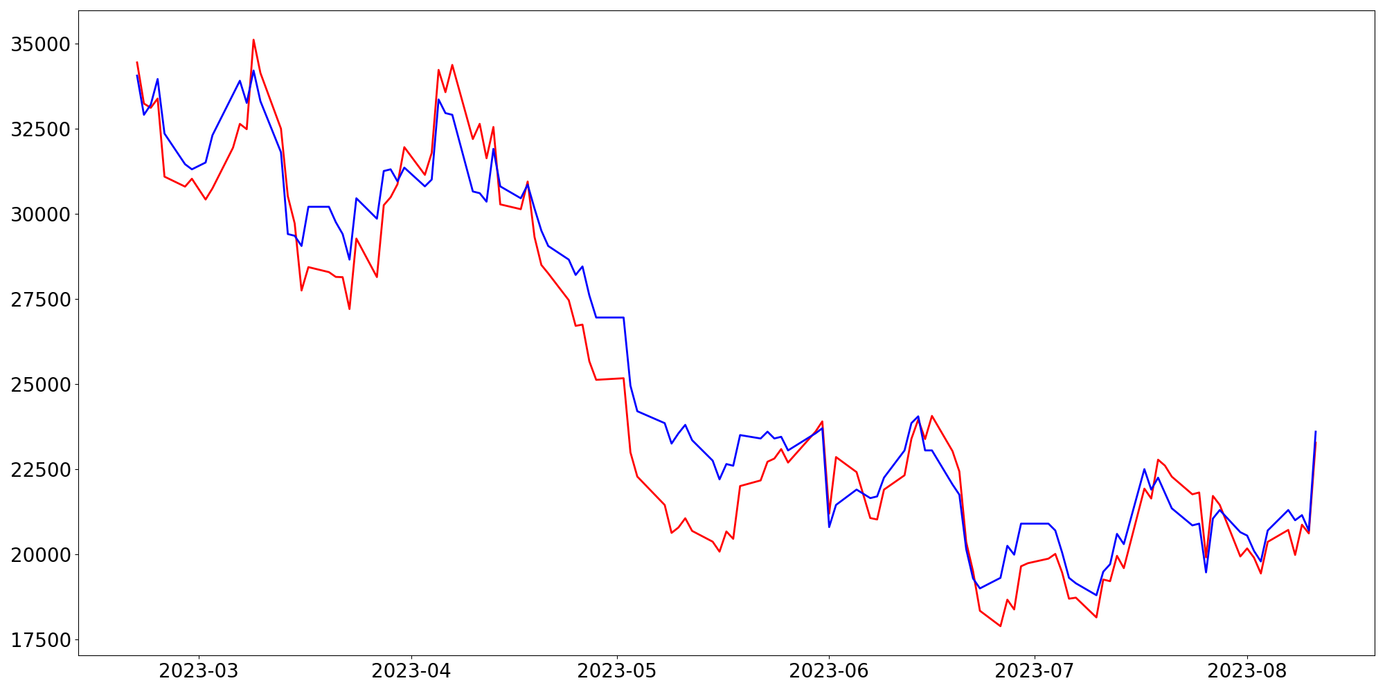 [ - : 실제값(종가) / - : 예측값(종가) ]