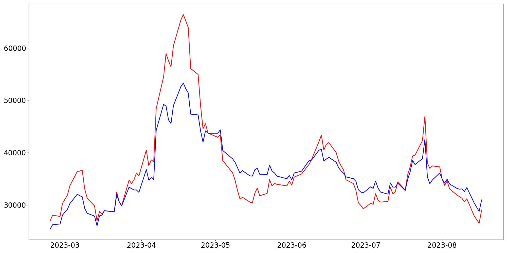 [ - : 실제값(종가) / - : 예측값(종가) ]