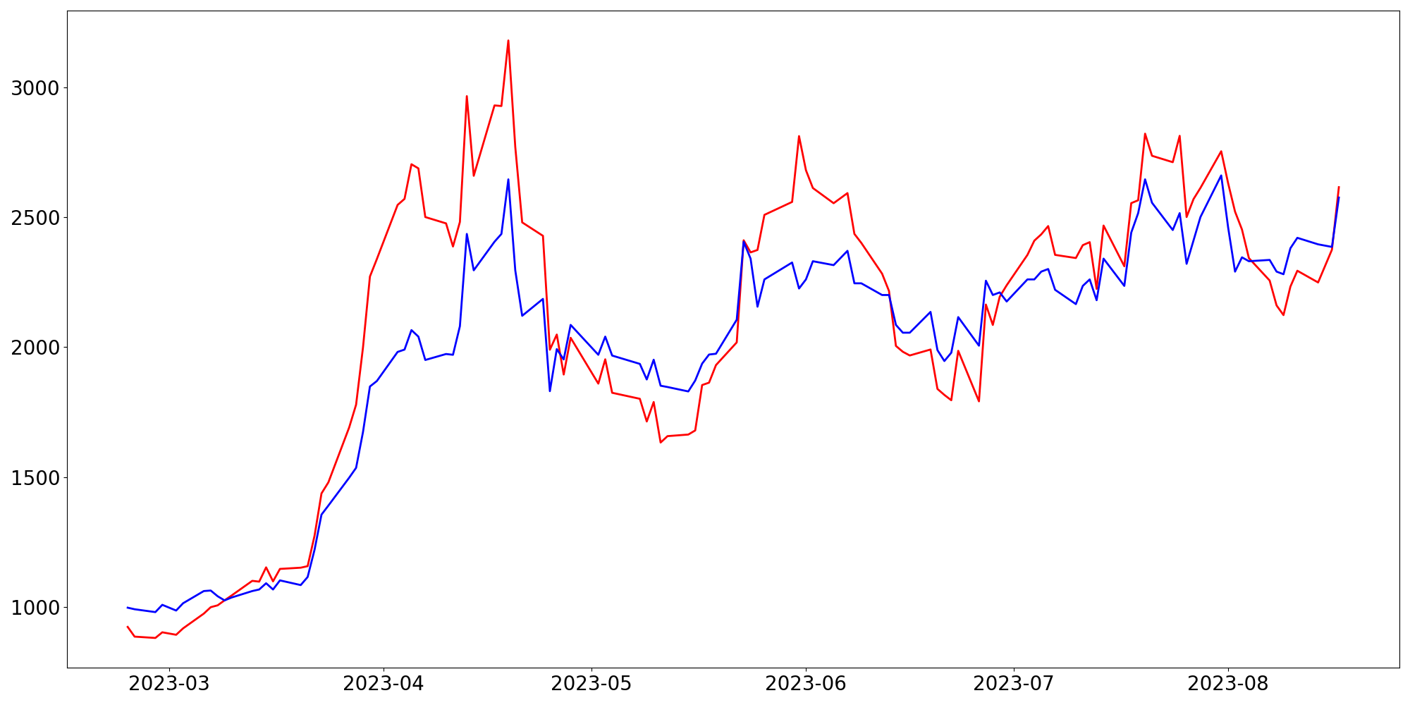 [ - : 실제값(종가) / - : 예측값(종가) ]