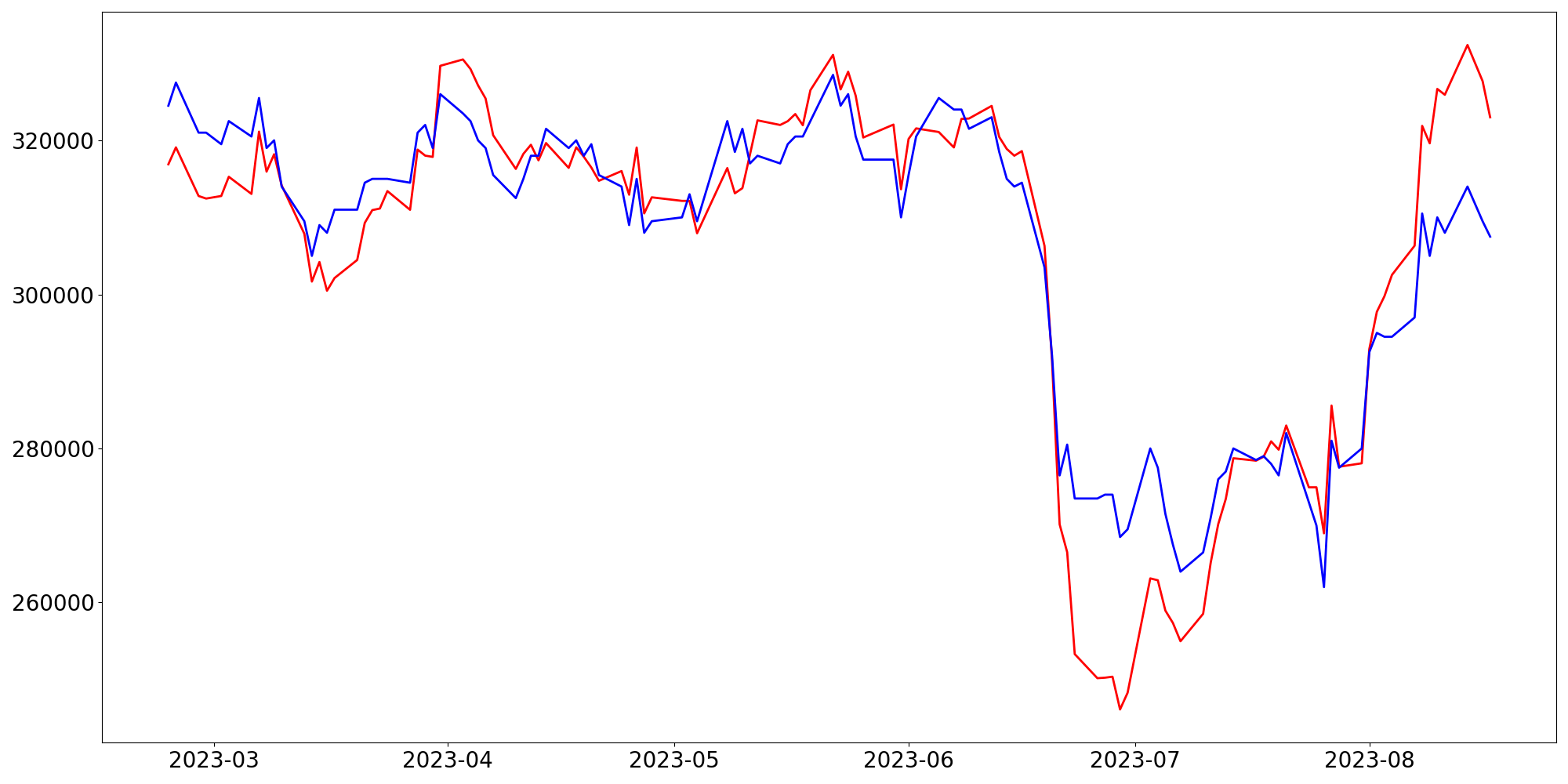 [ - : 실제값(종가) / - : 예측값(종가) ]