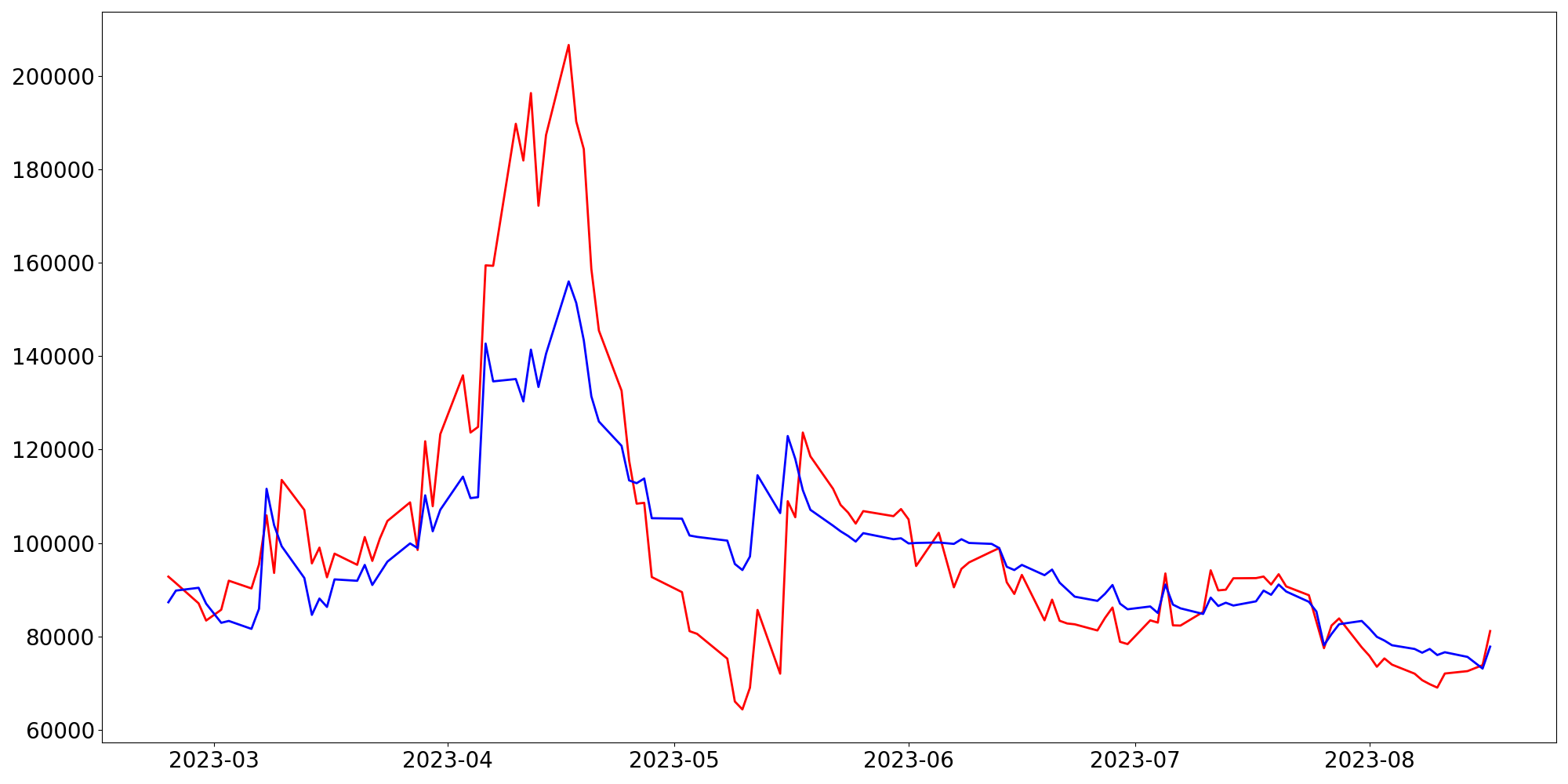 [ - : 실제값(종가) / - : 예측값(종가) ]