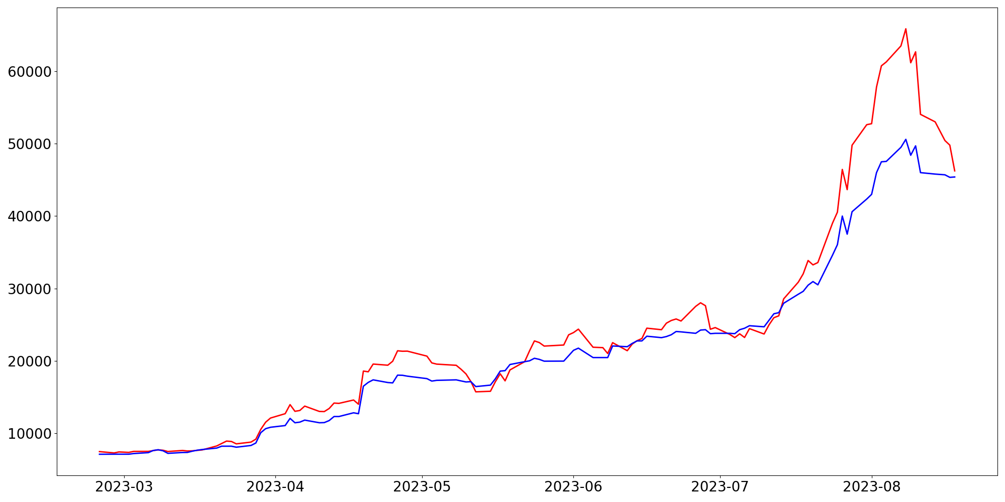 [ - : 실제값(종가) / - : 예측값(종가) ]