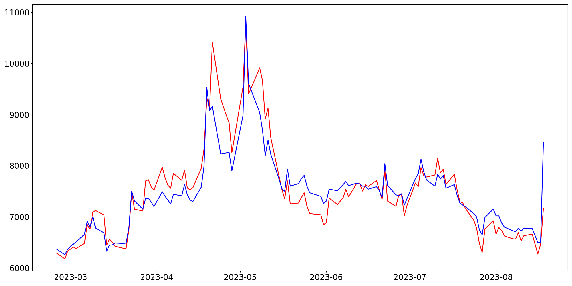 [ - : 실제값(종가) / - : 예측값(종가) ]