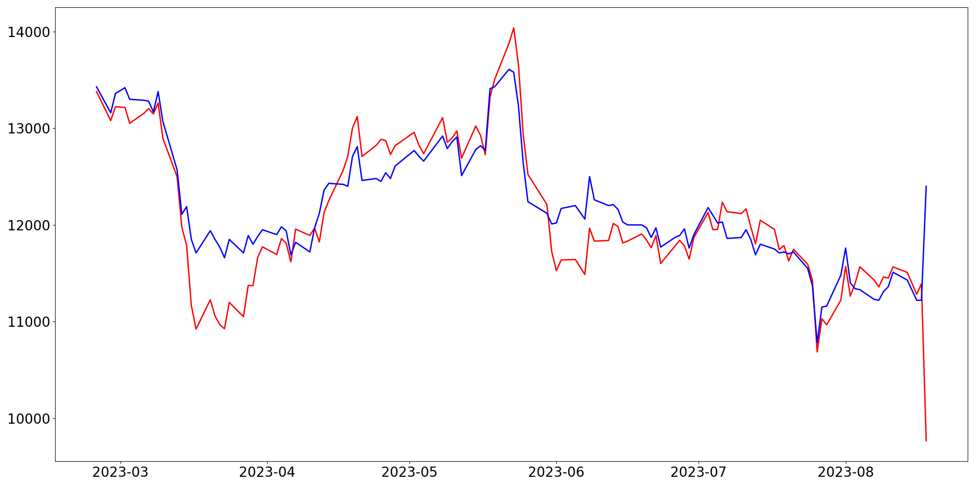 [ - : 실제값(종가) / - : 예측값(종가) ]