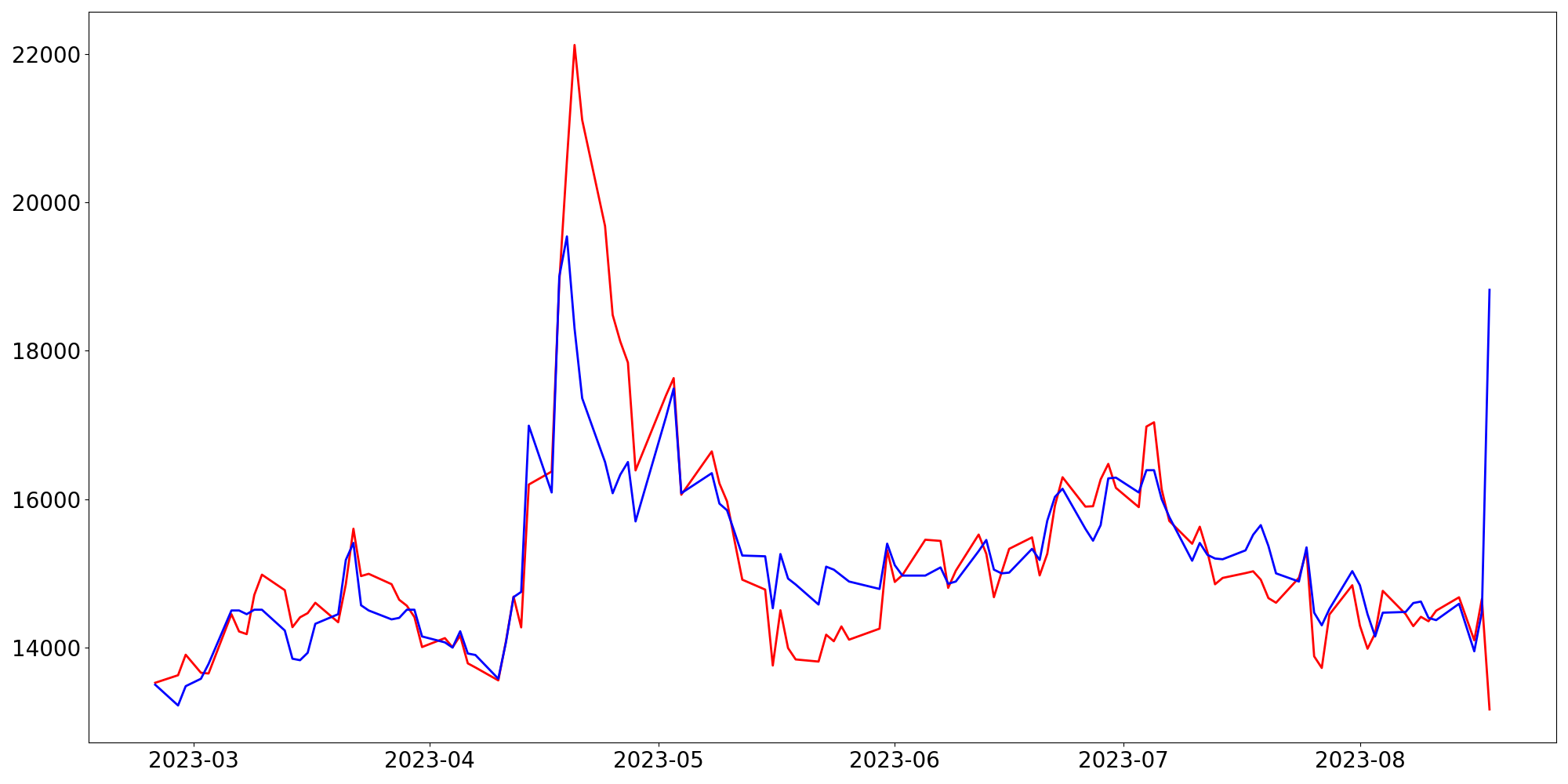 [ - : 실제값(종가) / - : 예측값(종가) ]