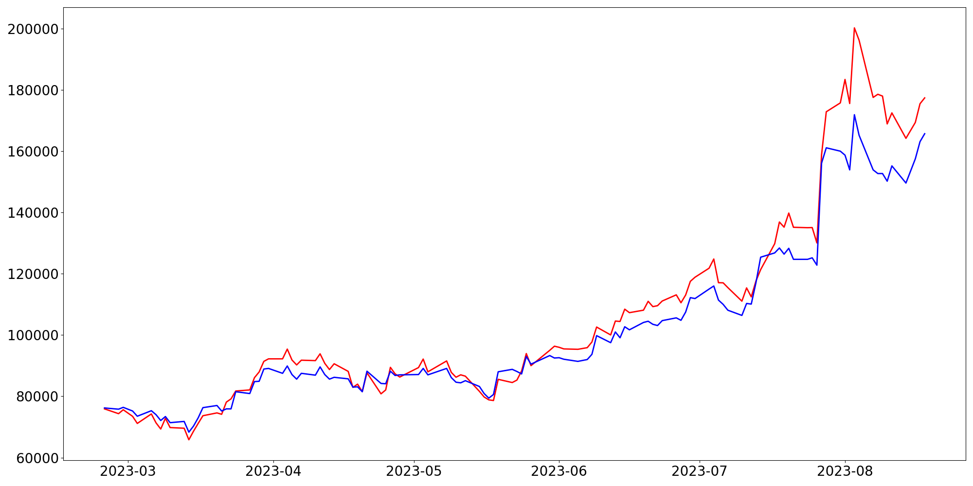 [ - : 실제값(종가) / - : 예측값(종가) ]