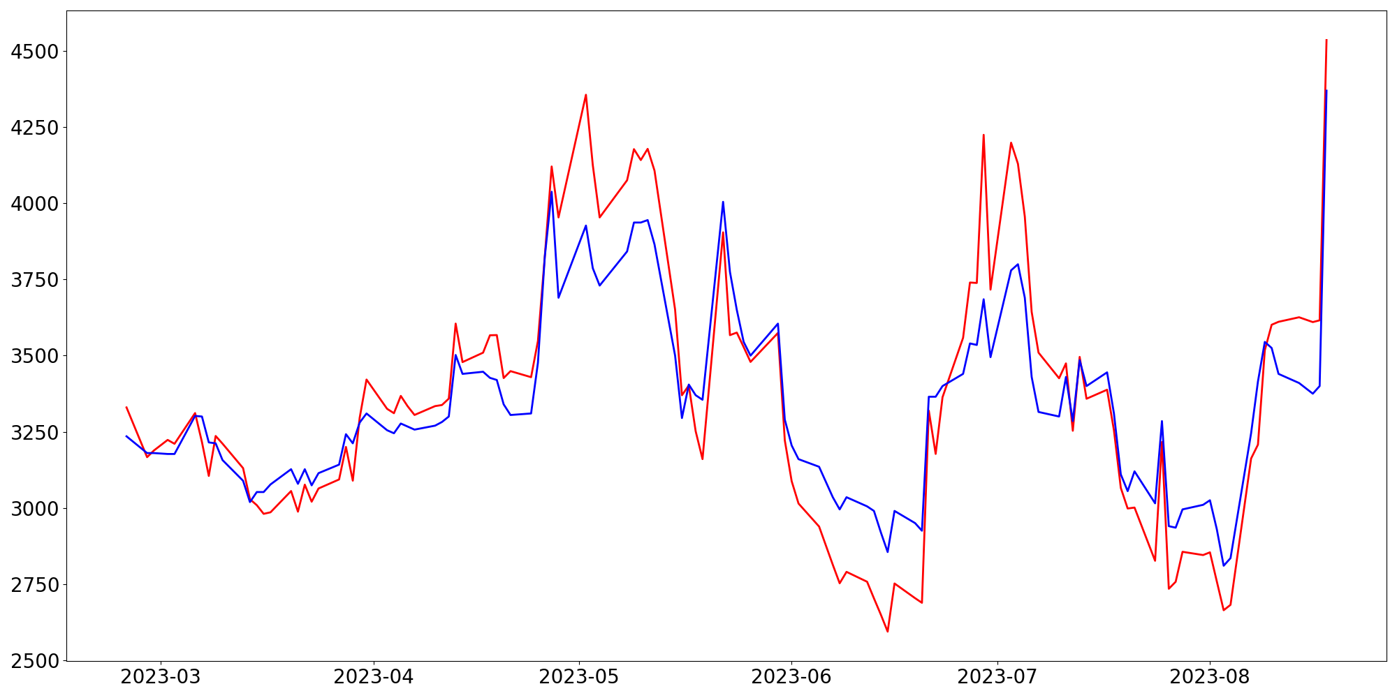 [ - : 실제값(종가) / - : 예측값(종가) ]
