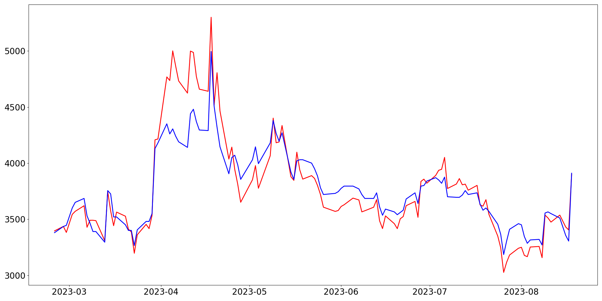 [ - : 실제값(종가) / - : 예측값(종가) ]