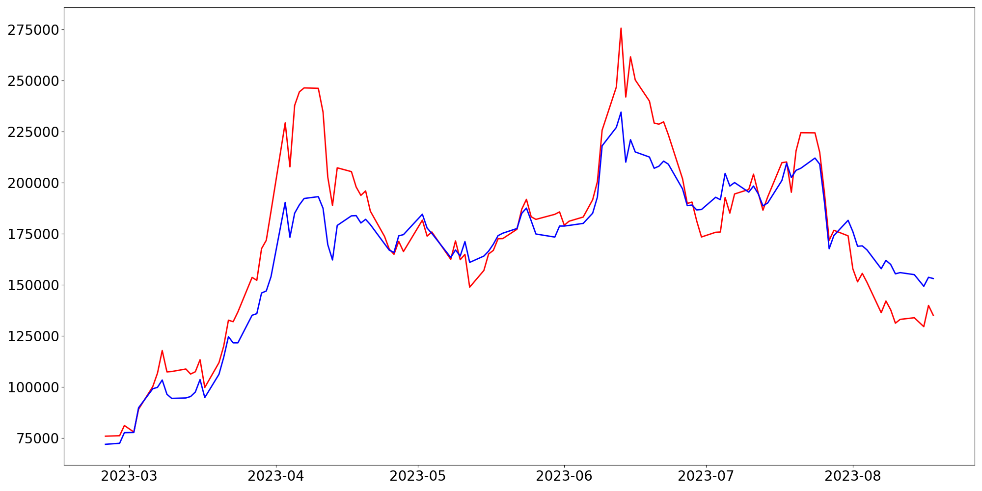 [ - : 실제값(종가) / - : 예측값(종가) ]