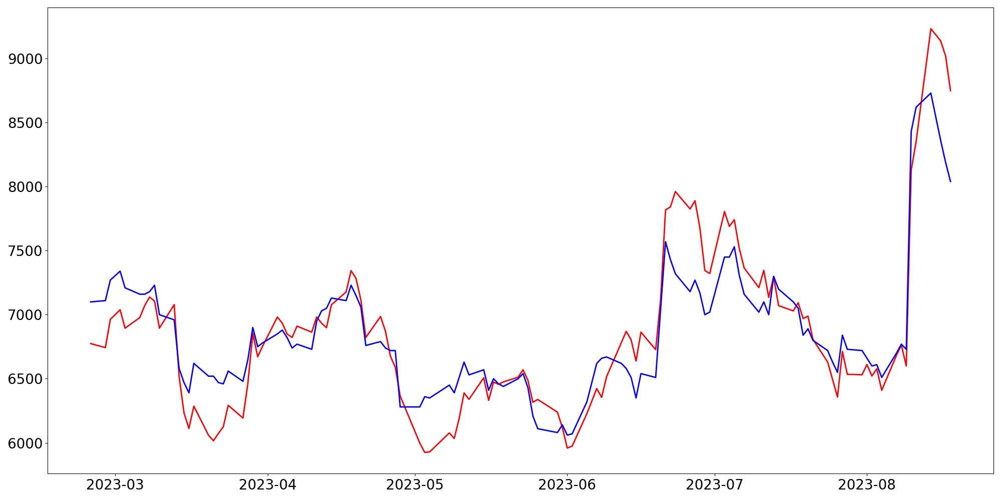 [ - : 실제값(종가) / - : 예측값(종가) ]
