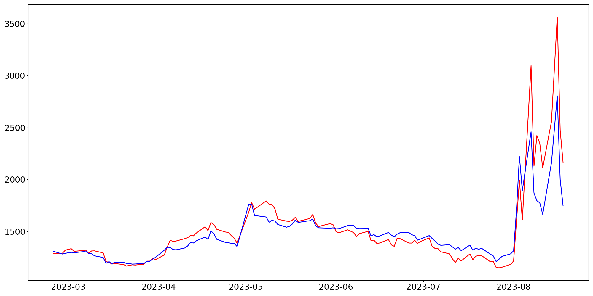 [ - : 실제값(종가) / - : 예측값(종가) ]