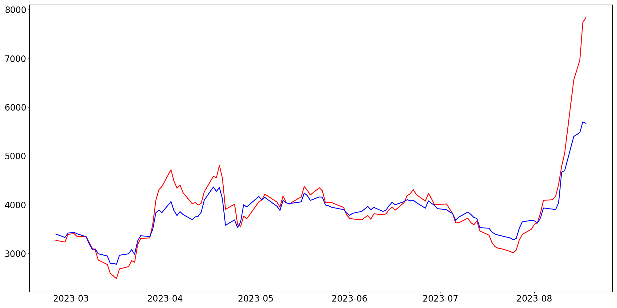 [ - : 실제값(종가) / - : 예측값(종가) ]