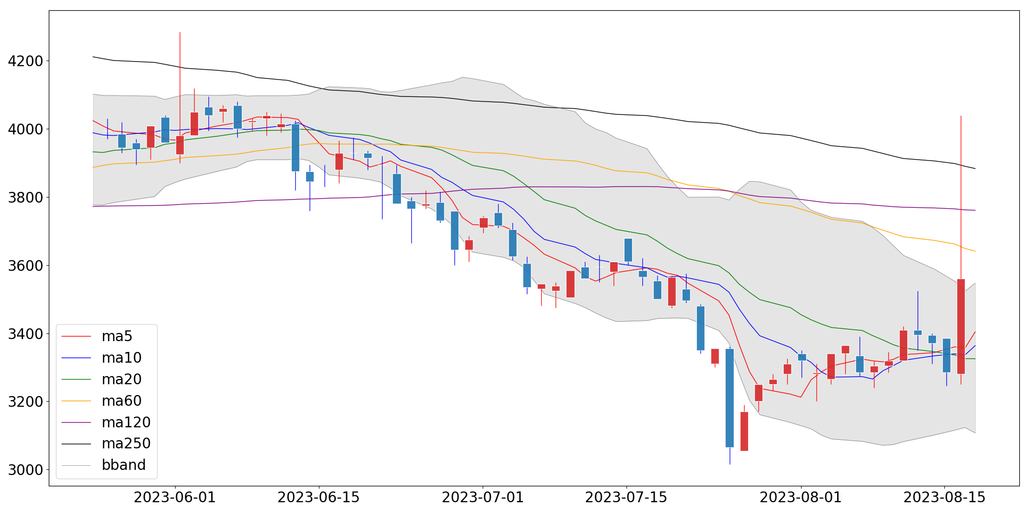 □ 장기 : 현재 종가가 장기(250일) 이동평균값(3,884원)을 하회 하여 장기적 추세 하락 중