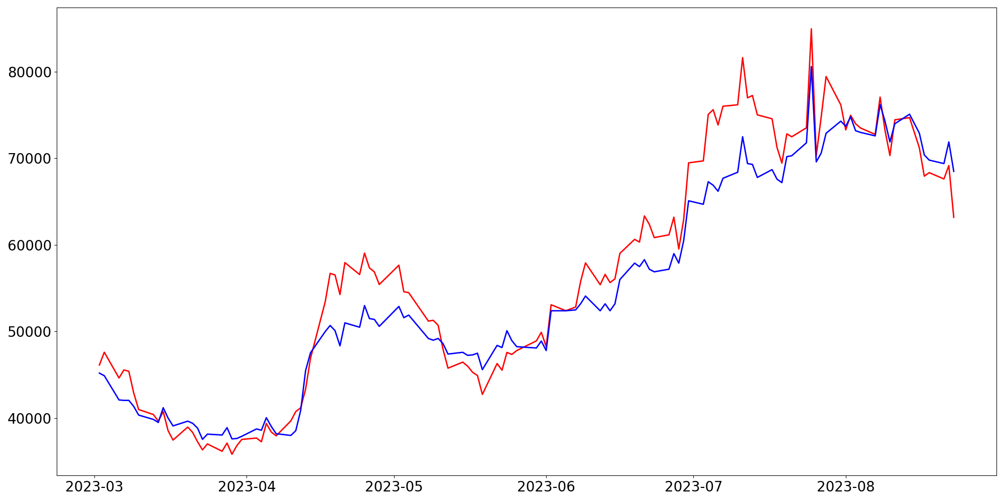 [ - : 실제값(종가) / - : 예측값(종가) ]
