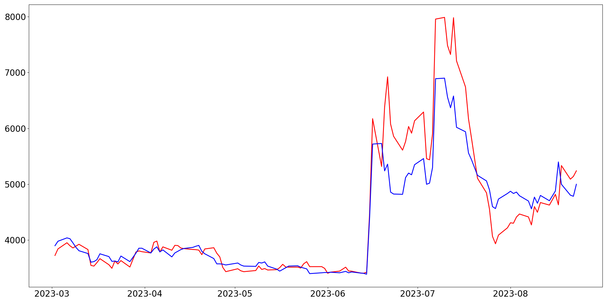 [ - : 실제값(종가) / - : 예측값(종가) ]