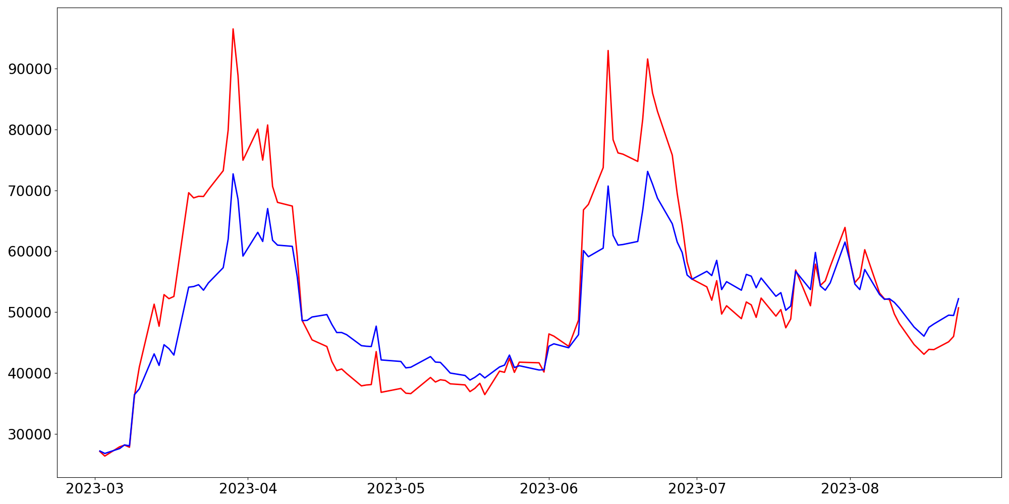 [ - : 실제값(종가) / - : 예측값(종가) ]