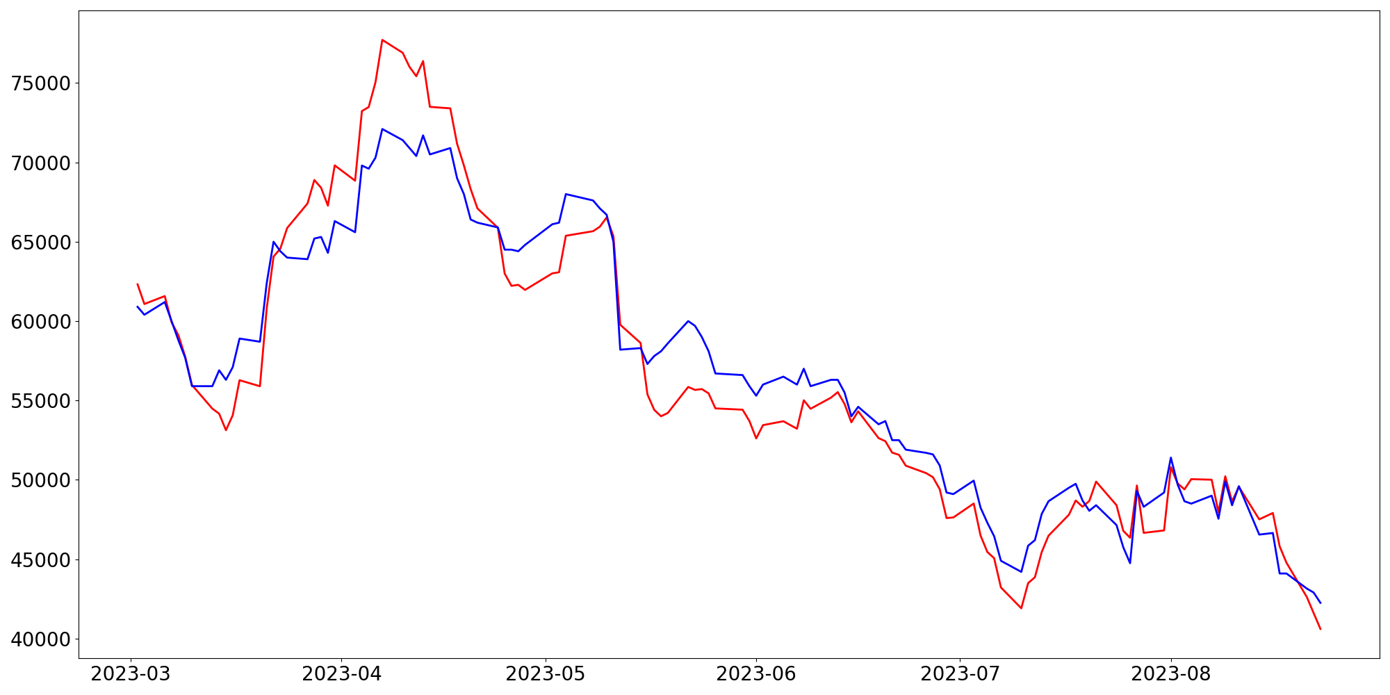 [ - : 실제값(종가) / - : 예측값(종가) ]