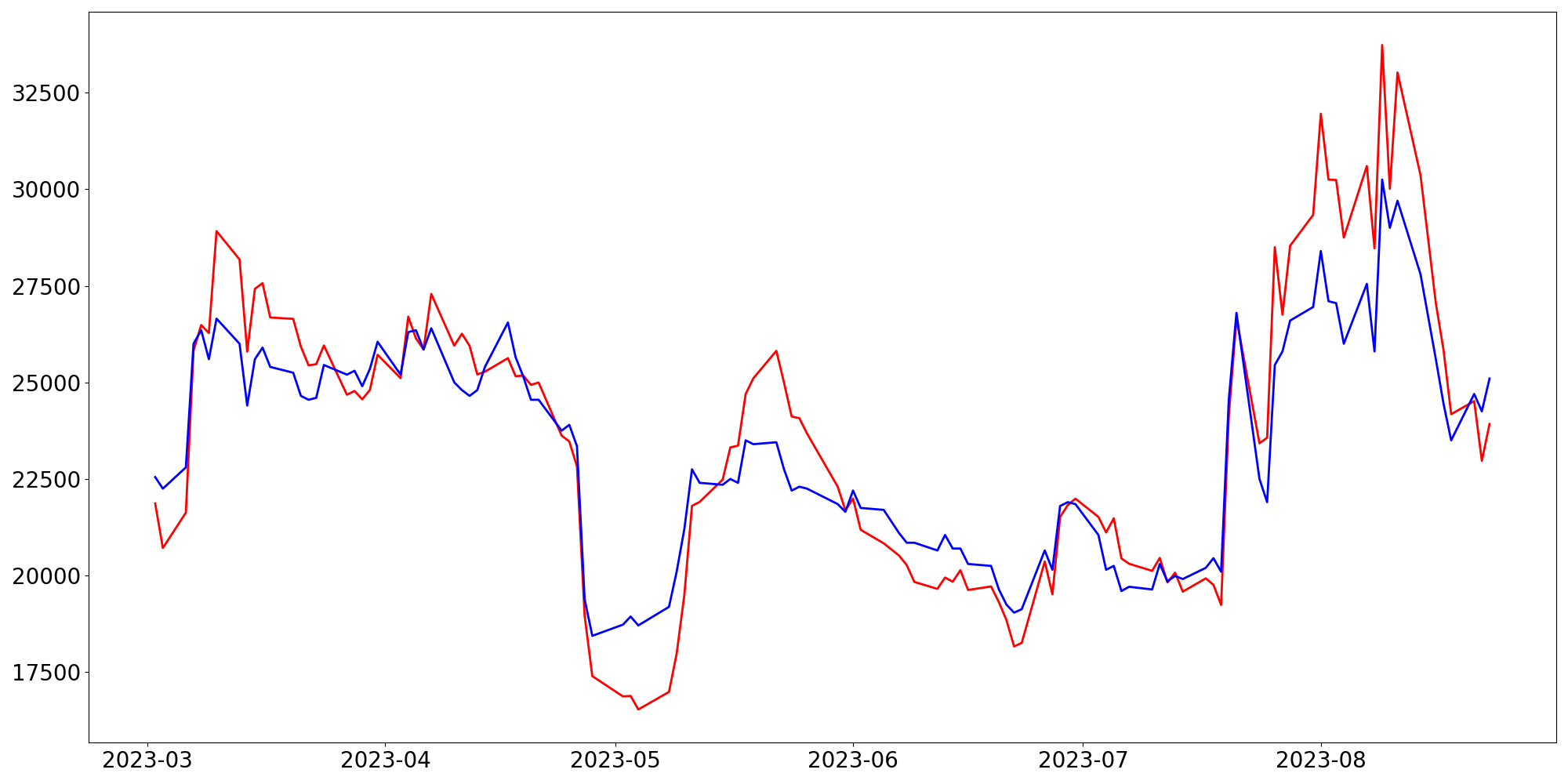 [ - : 실제값(종가) / - : 예측값(종가) ]