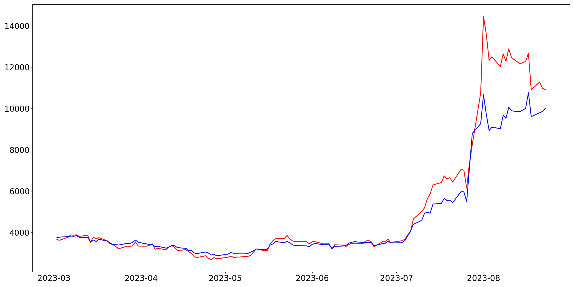 [ - : 실제값(종가) / - : 예측값(종가) ]