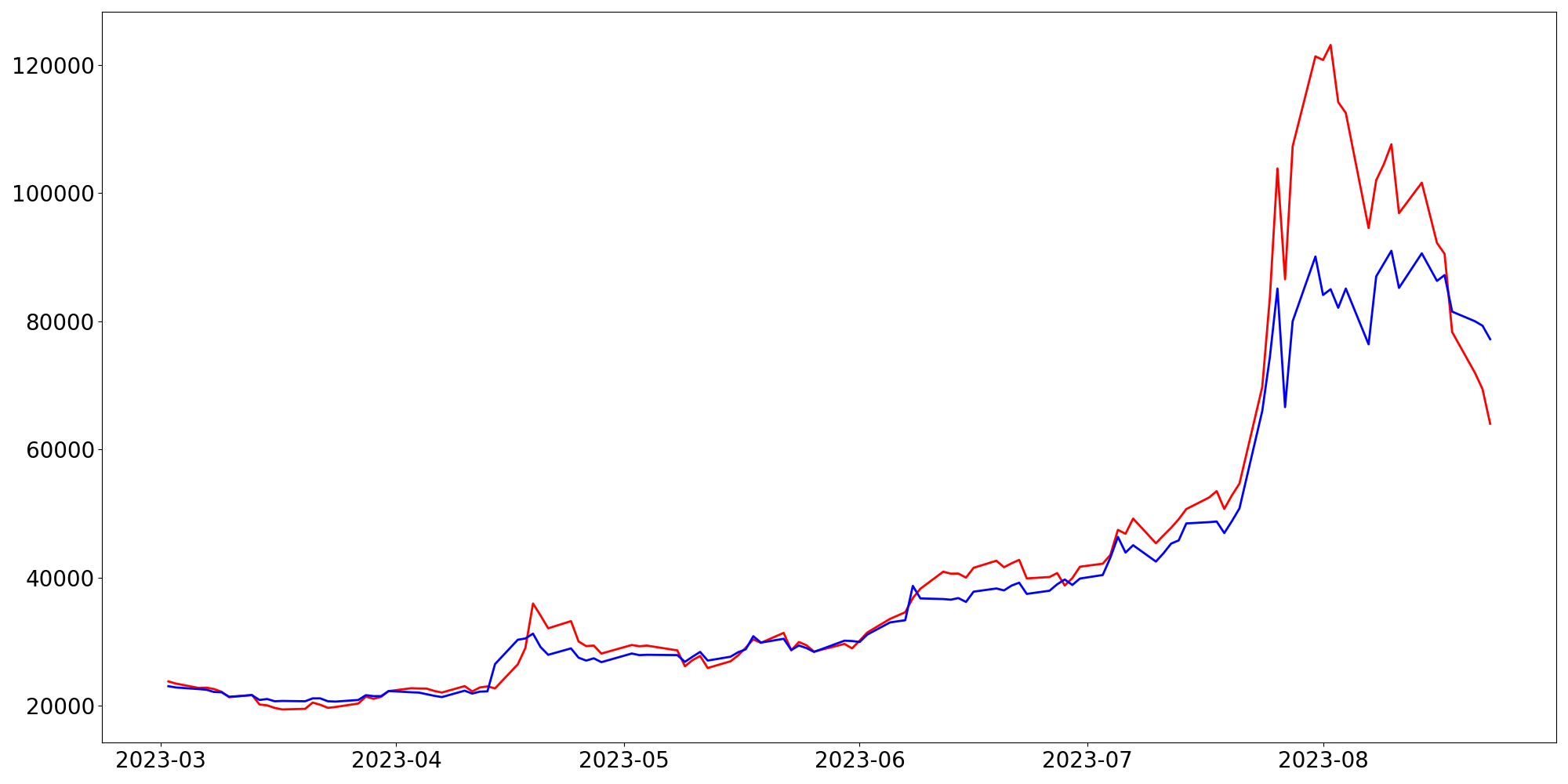 [ - : 실제값(종가) / - : 예측값(종가) ]