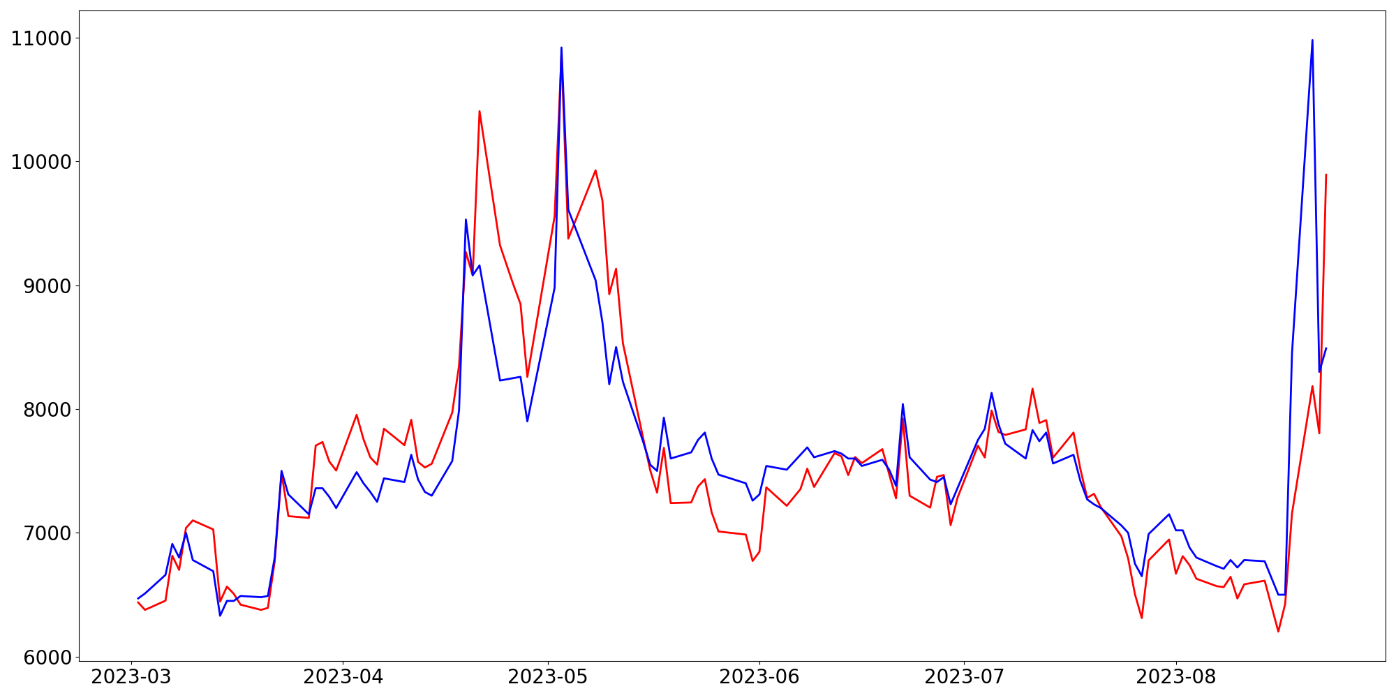[ - : 실제값(종가) / - : 예측값(종가) ]