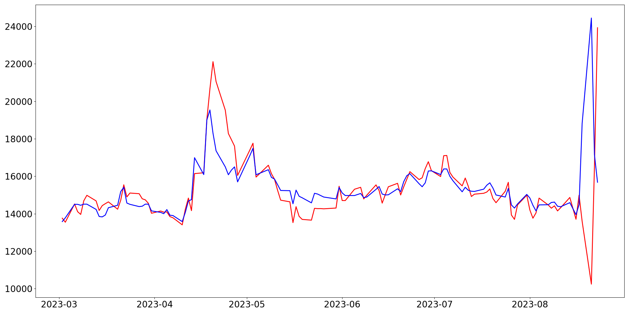 [ - : 실제값(종가) / - : 예측값(종가) ]