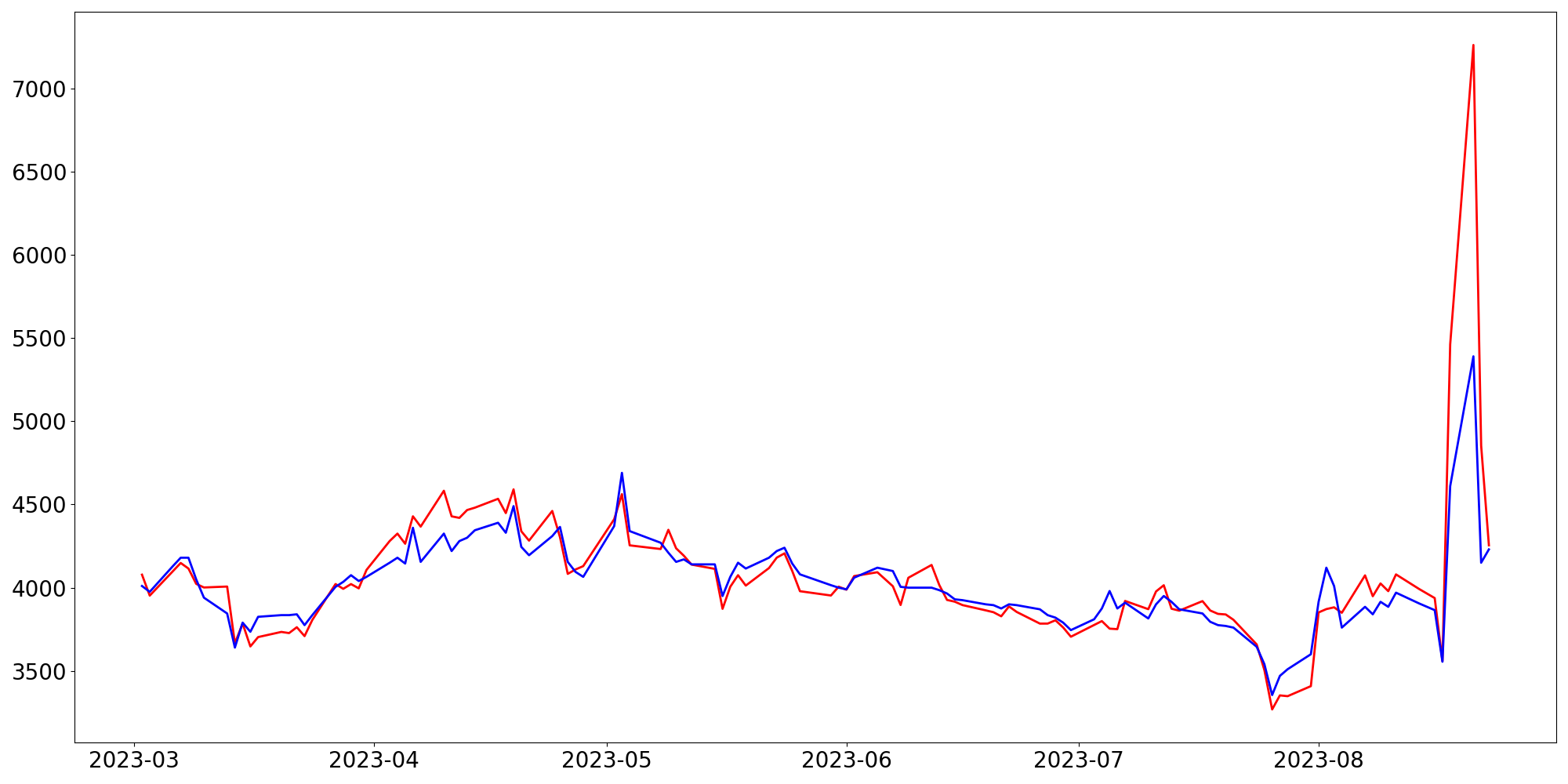 [ - : 실제값(종가) / - : 예측값(종가) ]