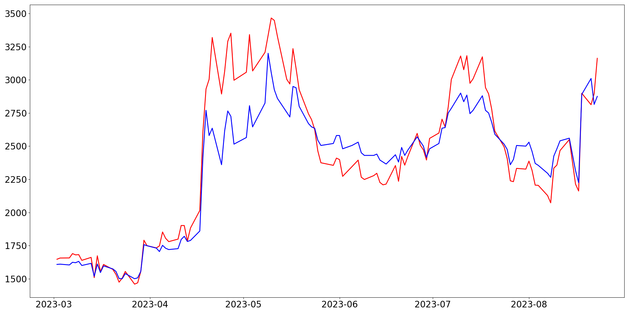 [ - : 실제값(종가) / - : 예측값(종가) ]