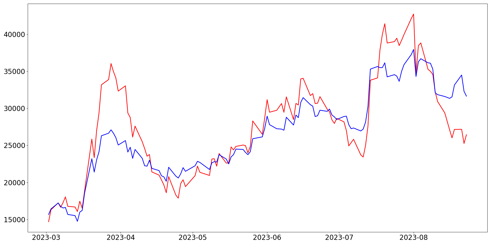[ - : 실제값(종가) / - : 예측값(종가) ]