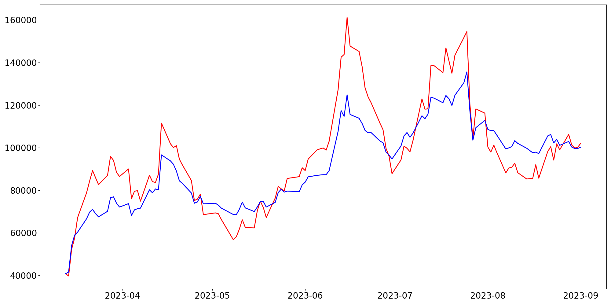 [ - : 실제값(종가) / - : 예측값(종가) ]