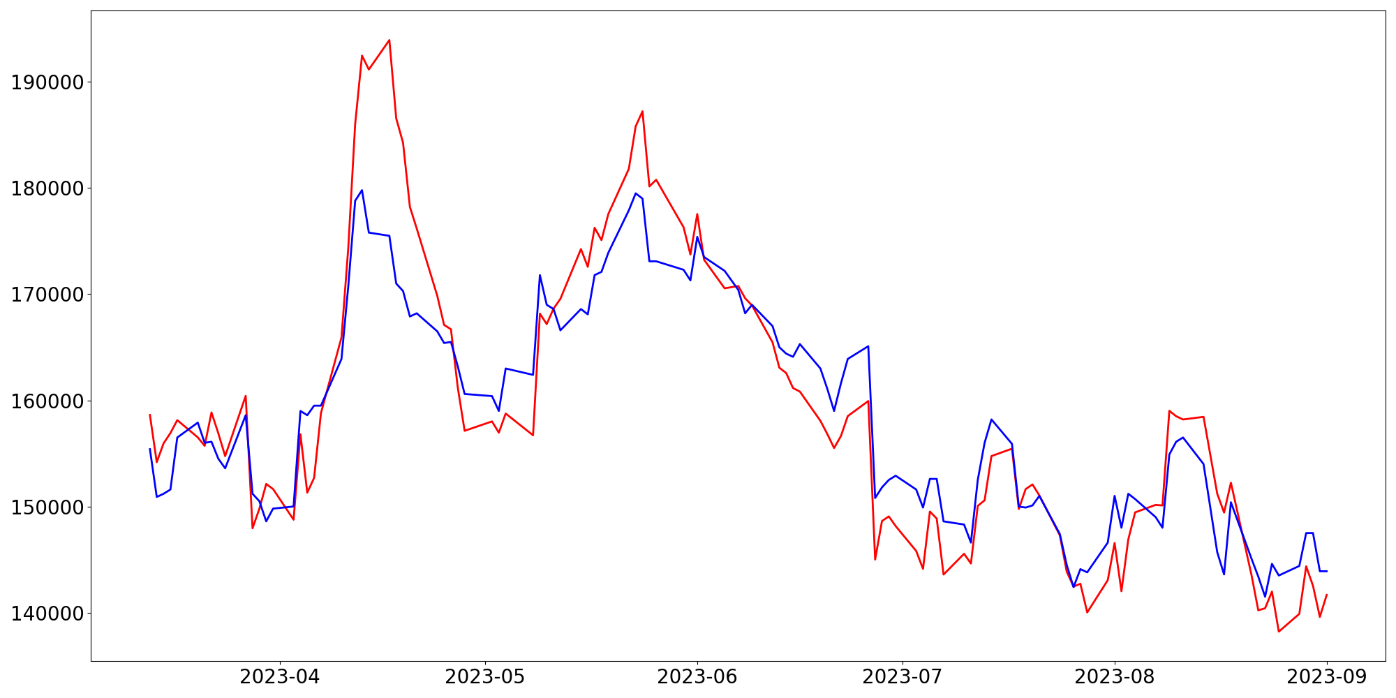 [ - : 실제값(종가) / - : 예측값(종가) ]