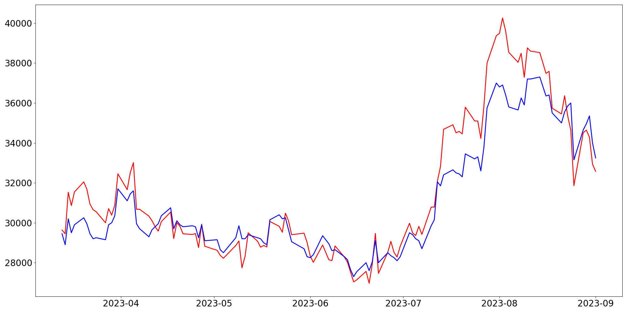 [ - : 실제값(종가) / - : 예측값(종가) ]