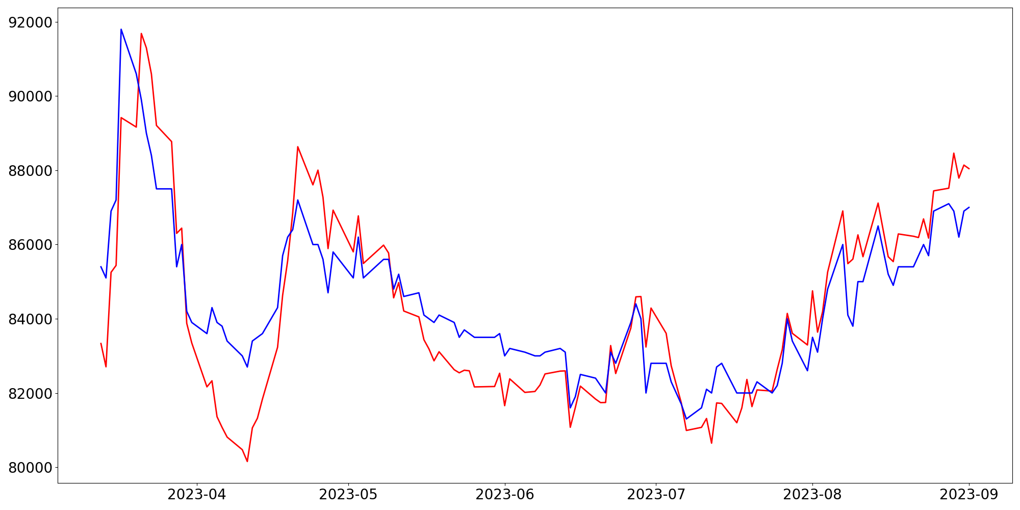 [ - : 실제값(종가) / - : 예측값(종가) ]