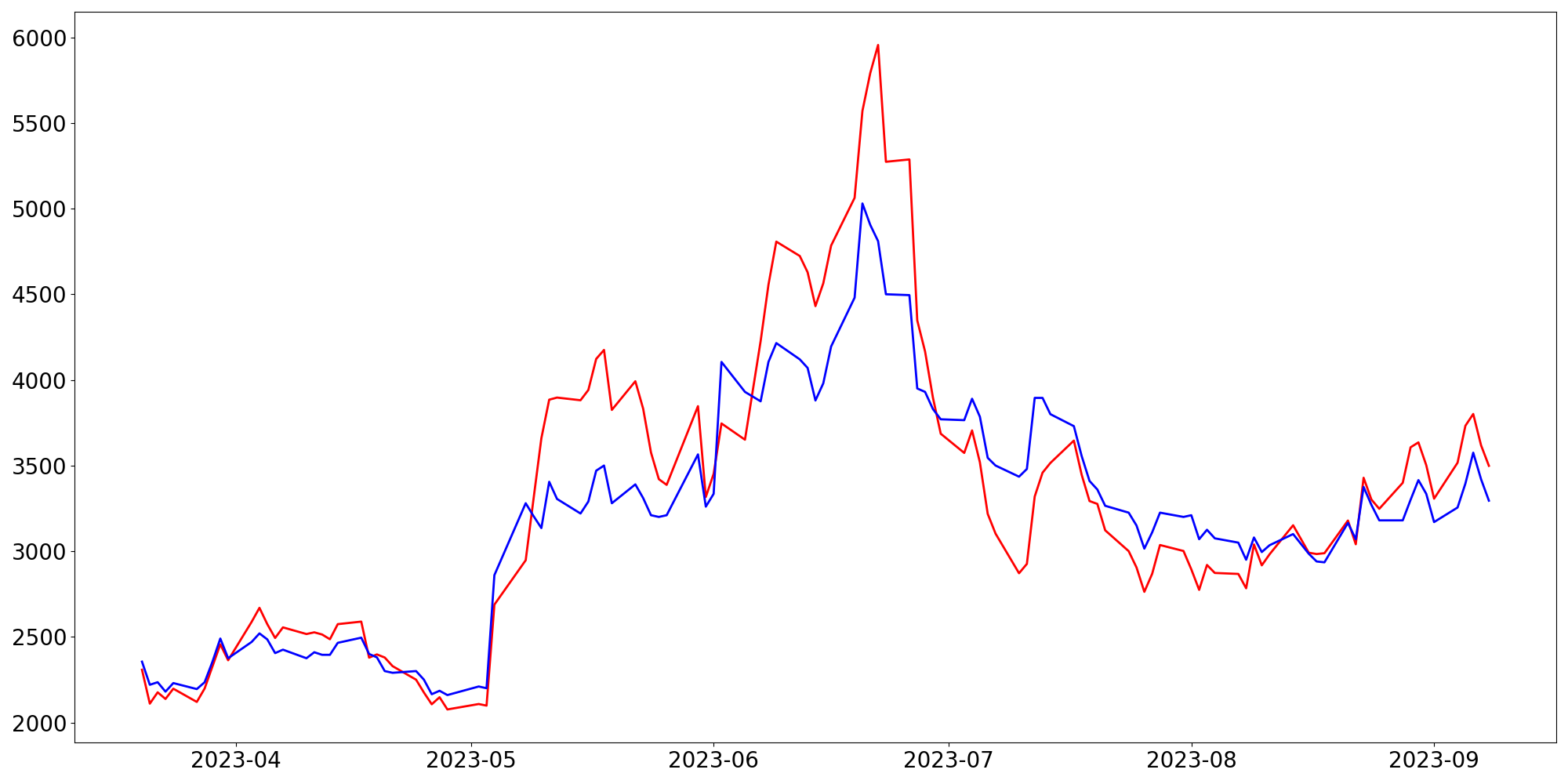 [ - : 실제값(종가) / - : 예측값(종가) ]