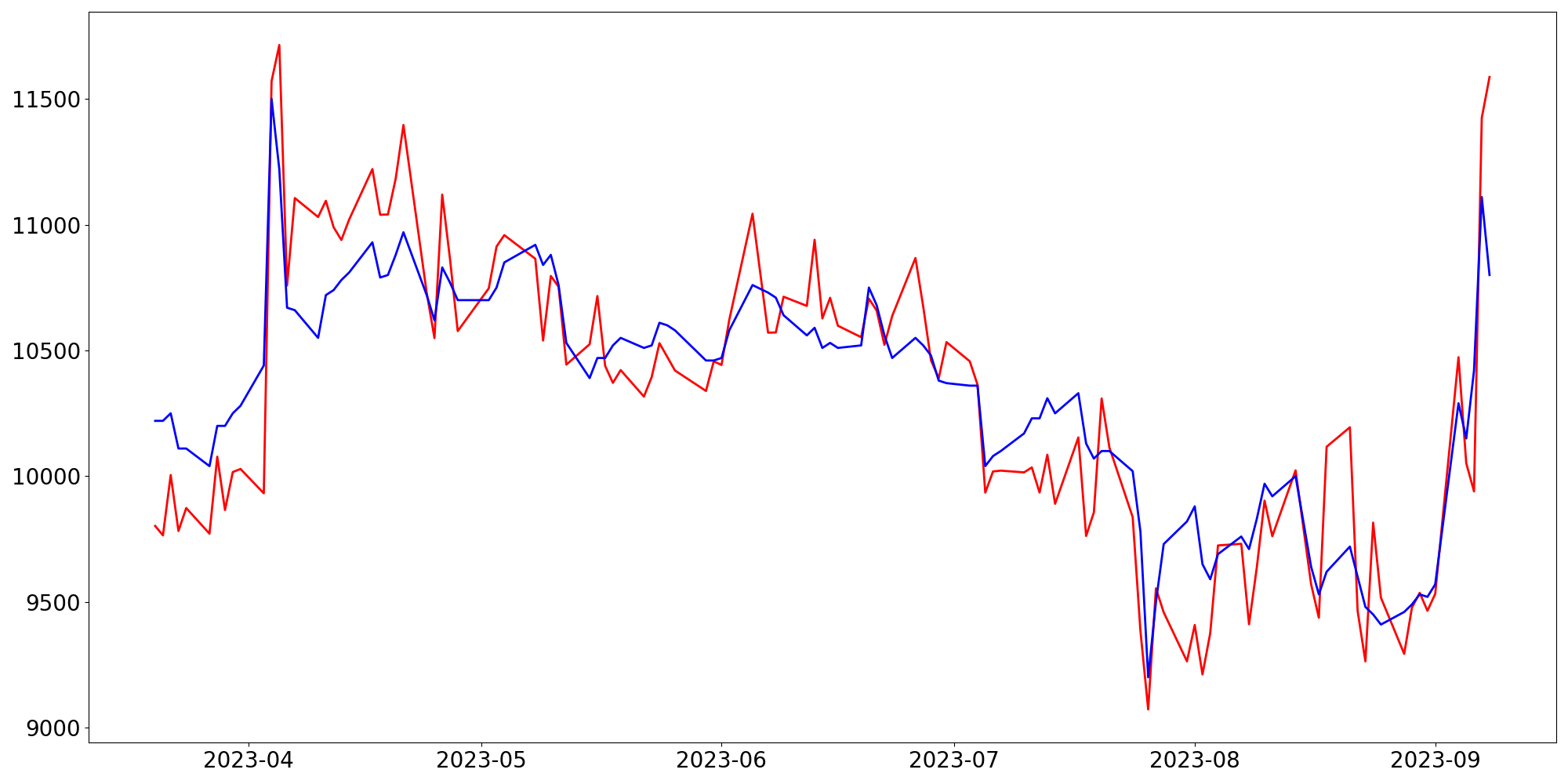 [ - : 실제값(종가) / - : 예측값(종가) ]