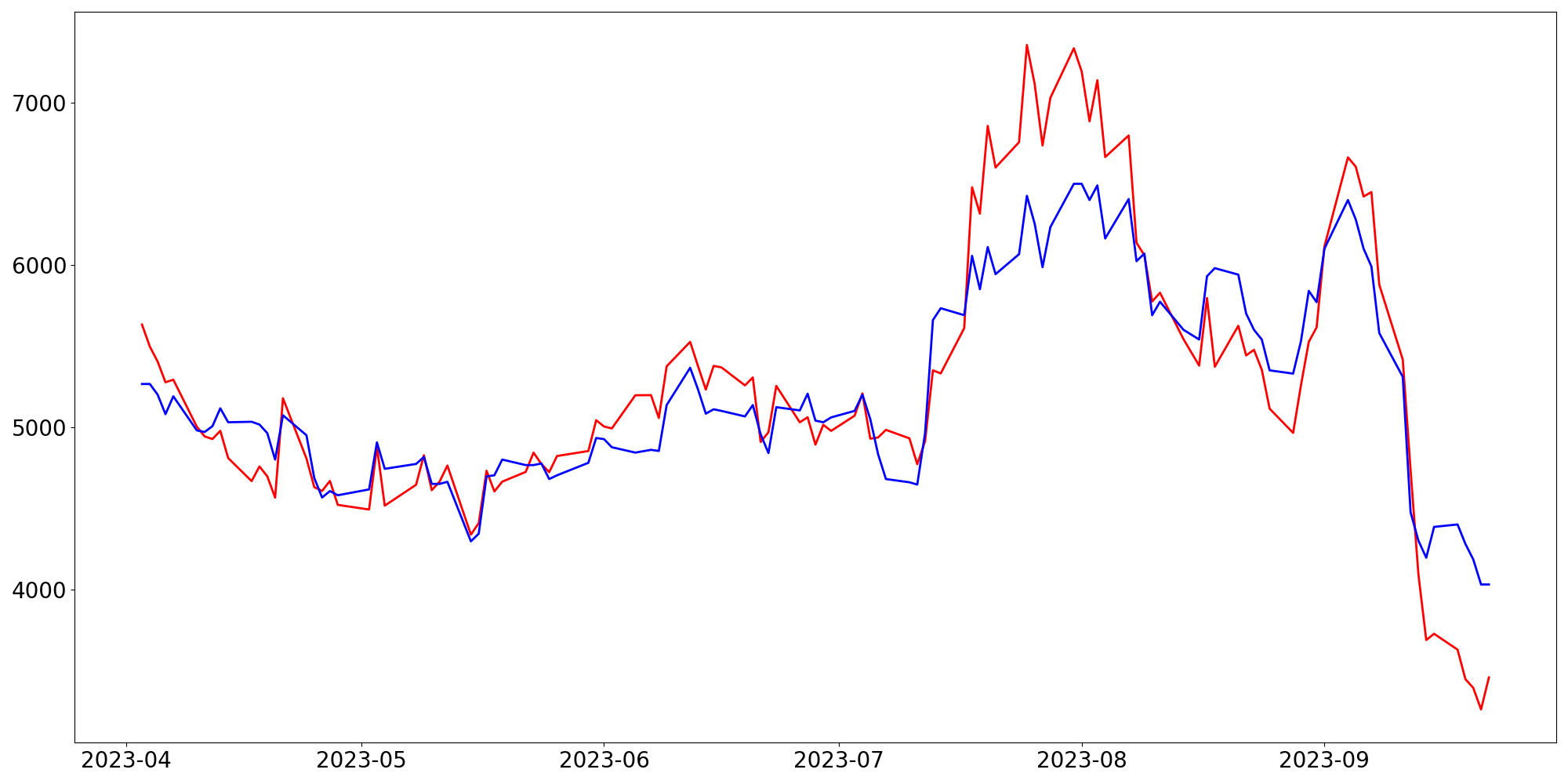 [ - : 실제값(종가) / - : 예측값(종가) ]