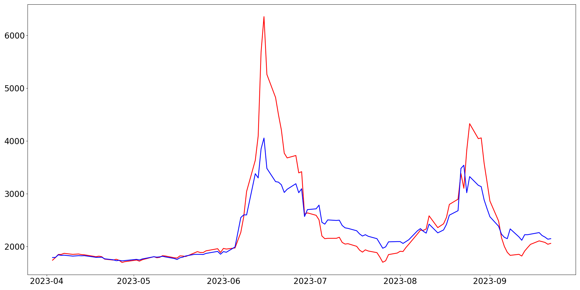[ - : 실제값(종가) / - : 예측값(종가) ]