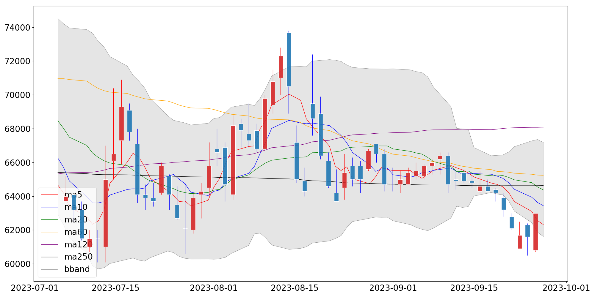 □ 중기 : 현재 종가가 중기(60일) 이동평균값(65,238원)을 하회 하여 중기적 추세 하락 중