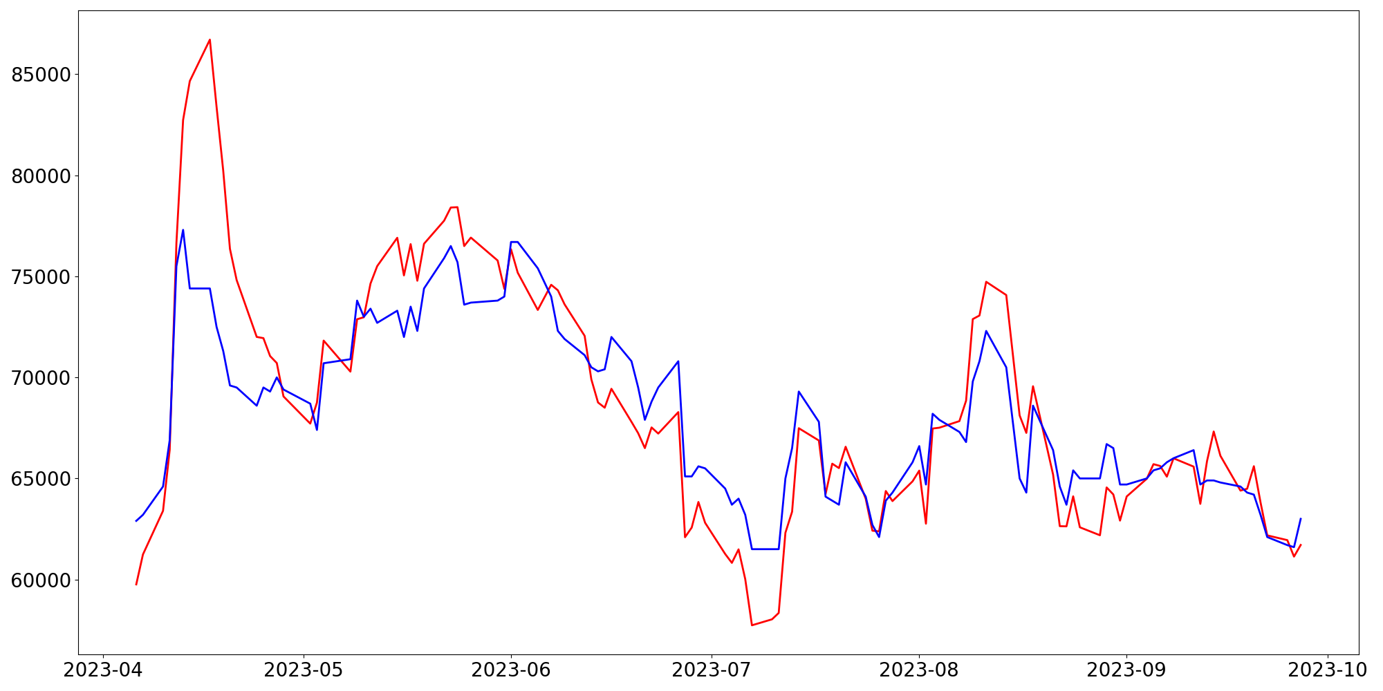 [ - : 실제값(종가) / - : 예측값(종가) ]