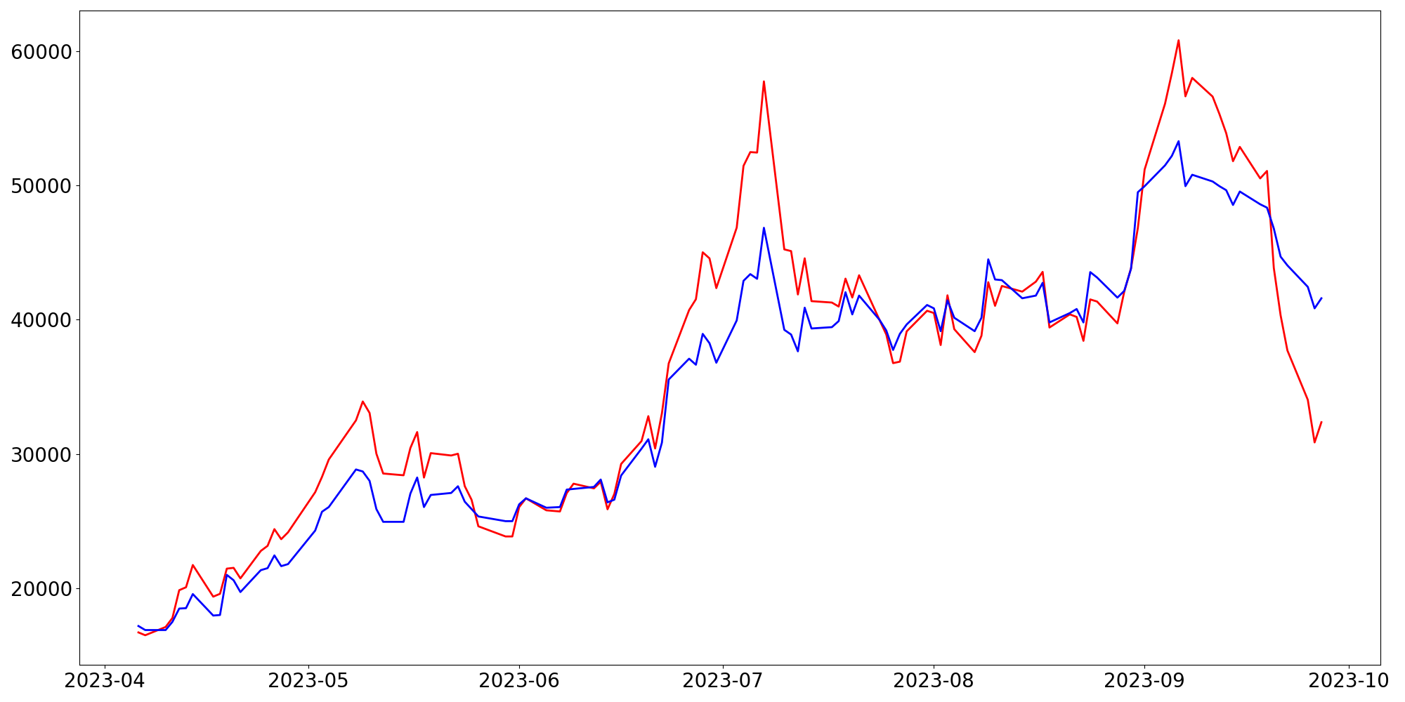 [ - : 실제값(종가) / - : 예측값(종가) ]