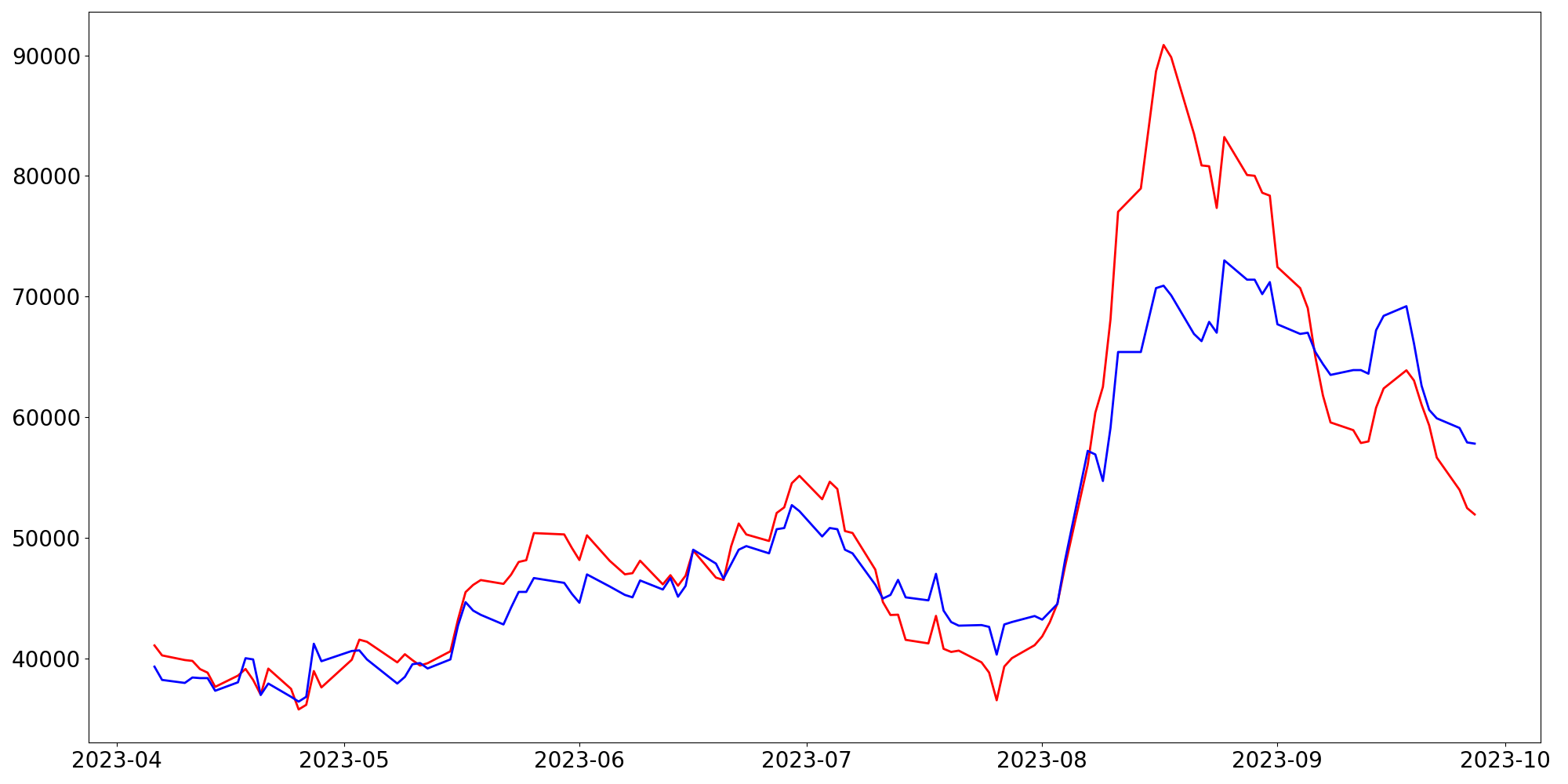 [ - : 실제값(종가) / - : 예측값(종가) ]