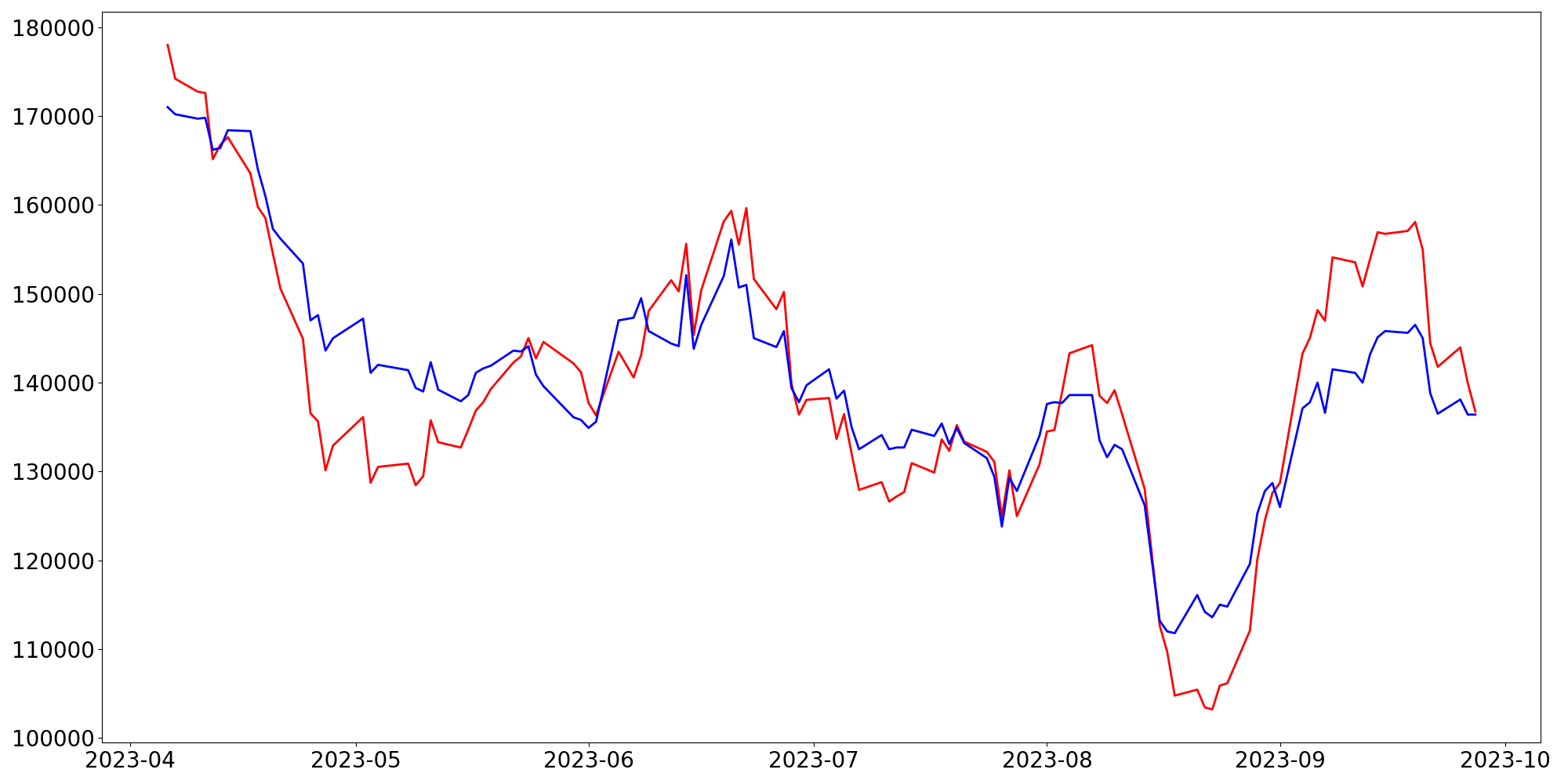 [ - : 실제값(종가) / - : 예측값(종가) ]