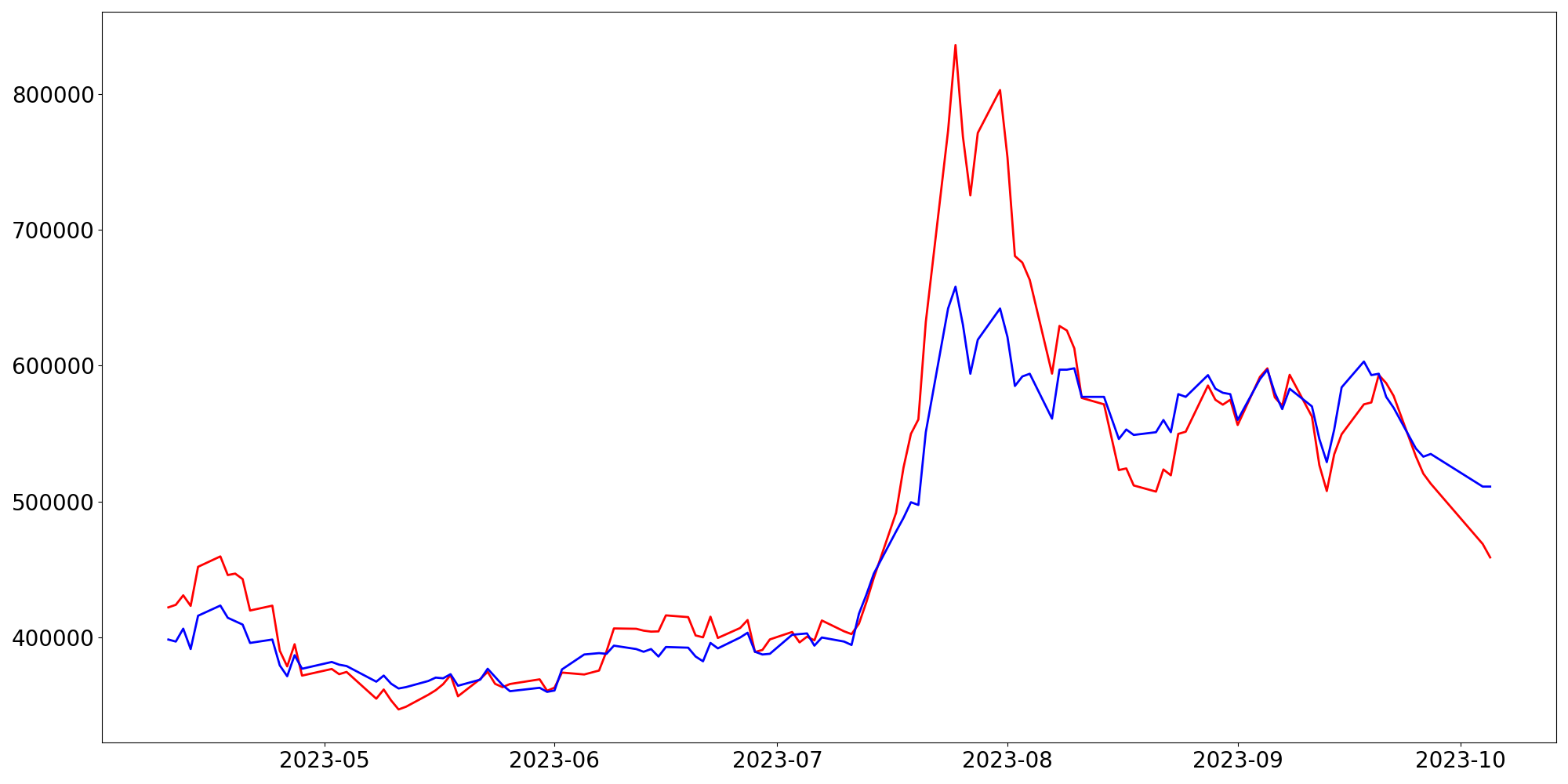 [ - : 실제값(종가) / - : 예측값(종가) ]