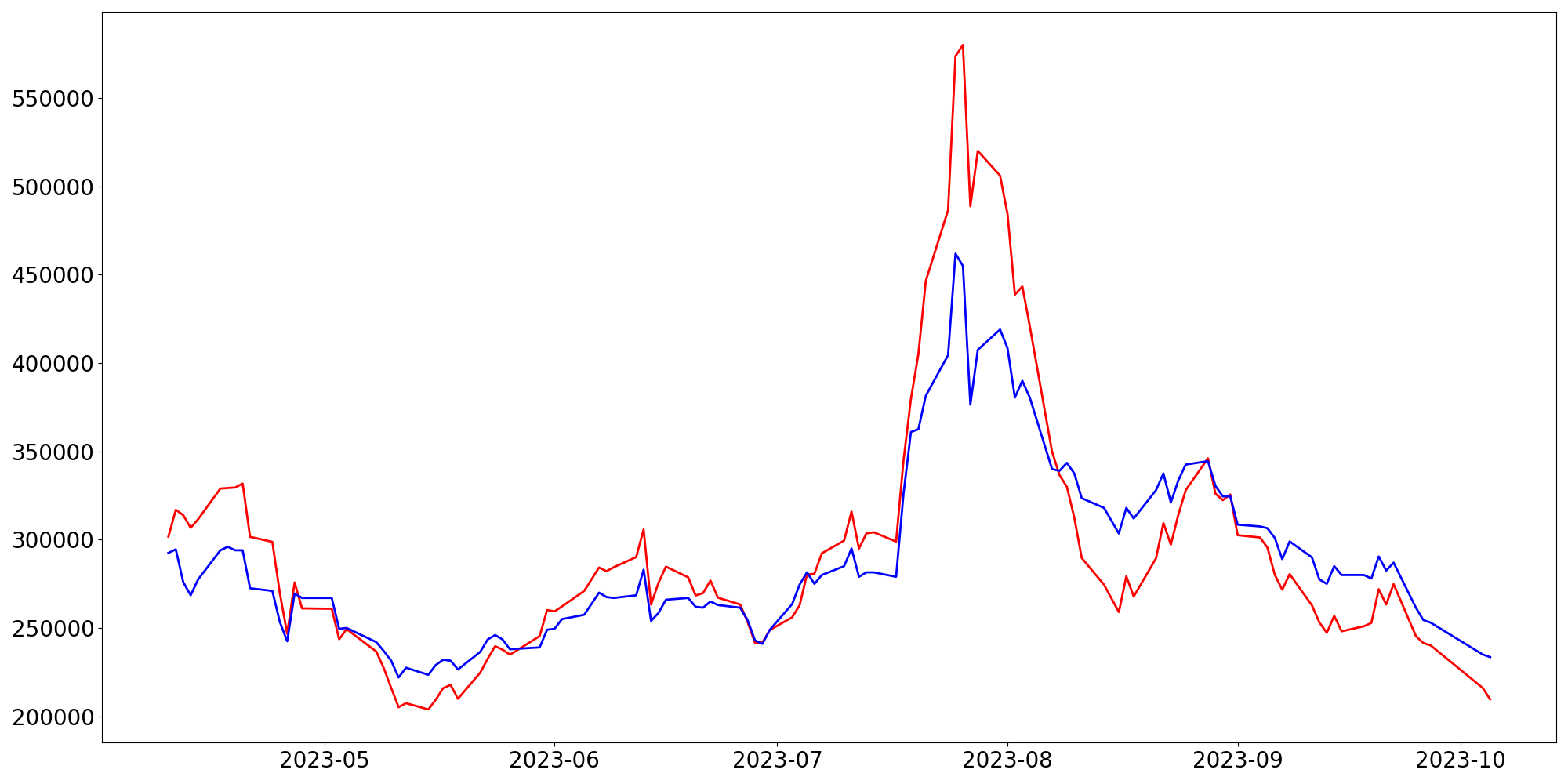 [ - : 실제값(종가) / - : 예측값(종가) ]