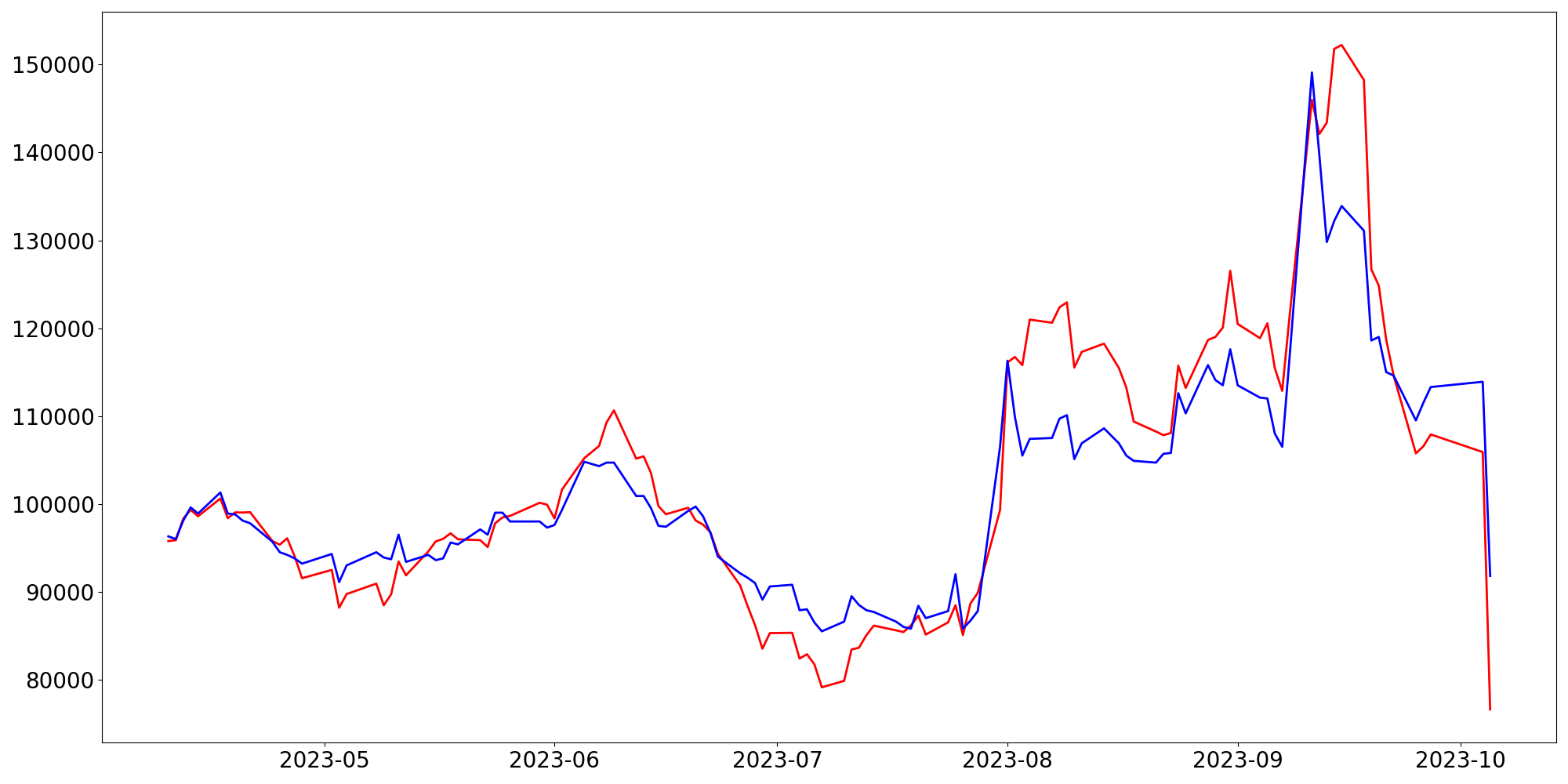 □ 오늘의 종가 : 91,800 (-22,100, -19.40%)
