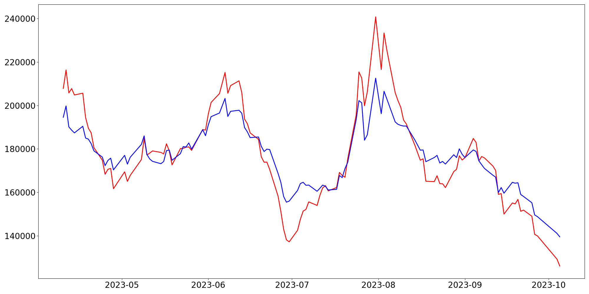 [ - : 실제값(종가) / - : 예측값(종가) ]