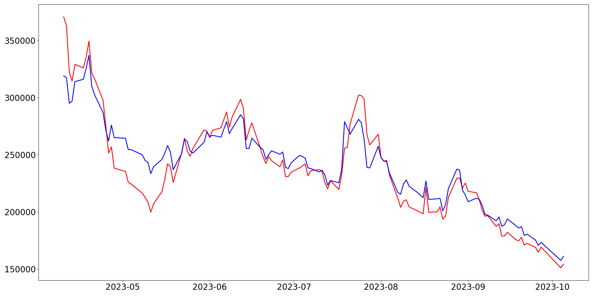 [ - : 실제값(종가) / - : 예측값(종가) ]