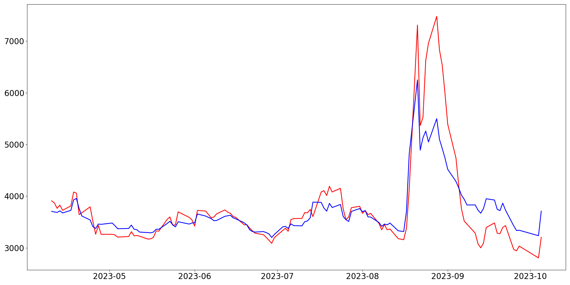 [ - : 실제값(종가) / - : 예측값(종가) ]