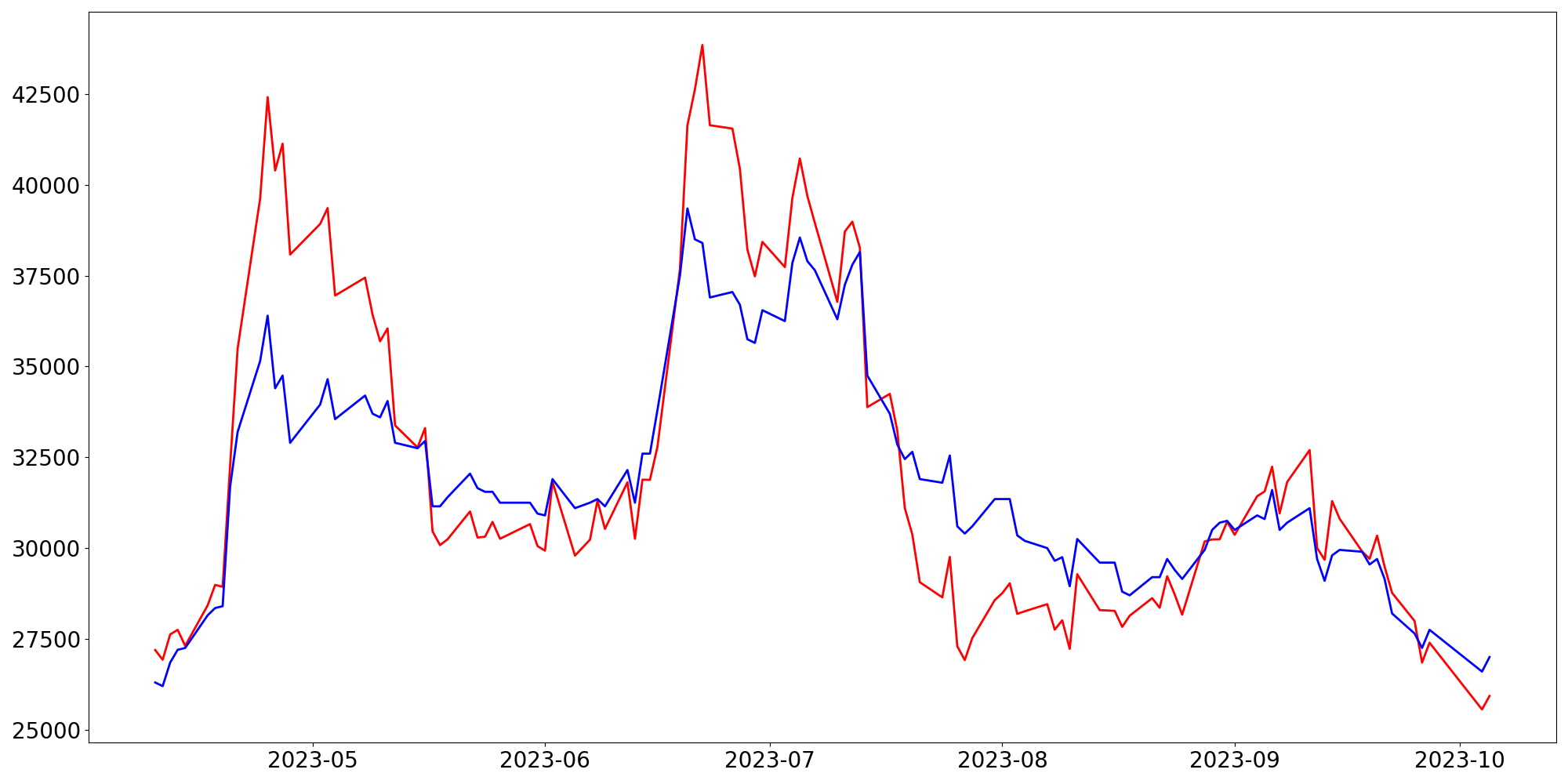 [ - : 실제값(종가) / - : 예측값(종가) ]